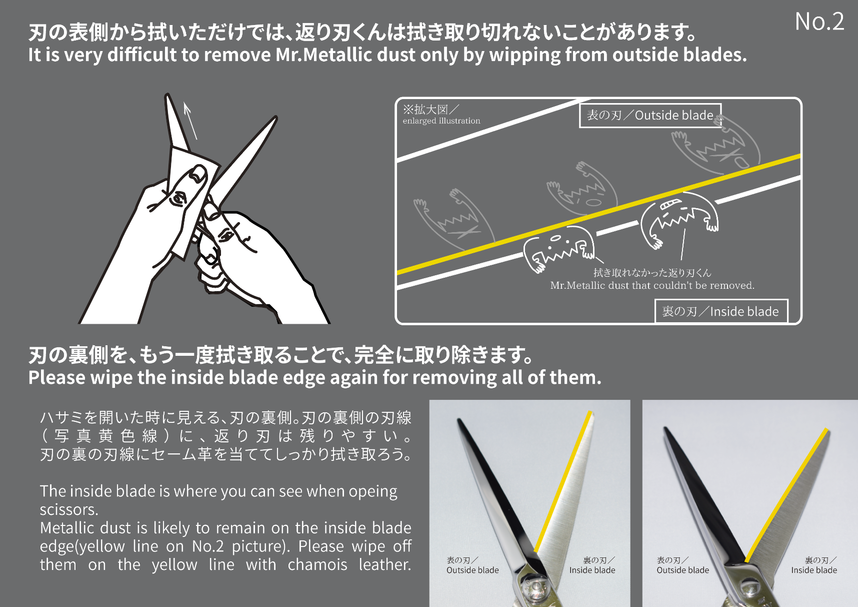 As in the picture No.2, the bending Mr. Metallic dust on the inside blade edge are very difficult to remove, so please wipe there carefully.